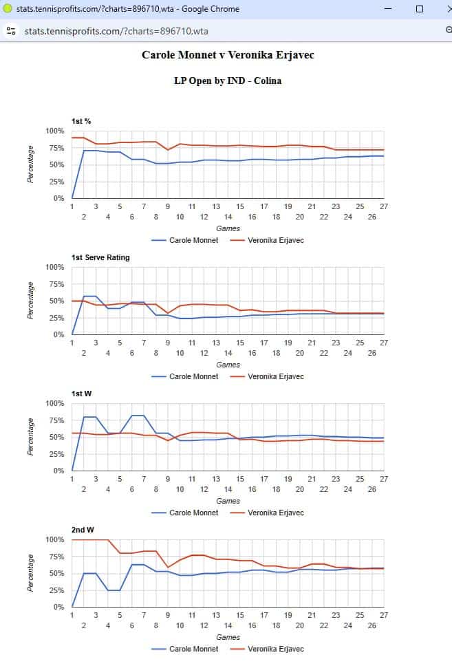 The graphs below show how the players’ stats changed during the match. You can see the decline in Erjavec’s 1st serve points won and 2nd serve points won percentages. It was her 2nd serve that just about held her together in that first set.