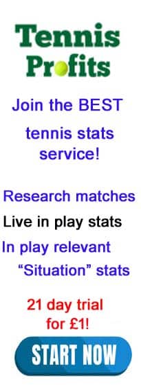 These tips are taken from the Tennis Trading Tips email. Get information, stats and tips on every main tour match 7 days a week. Every day, I research all the ATP and WTA matches and write trading notes for my own use. I refer to these notes during the trading session and will not trade a match until I have used the notes to remind me of my trading plan for that match.